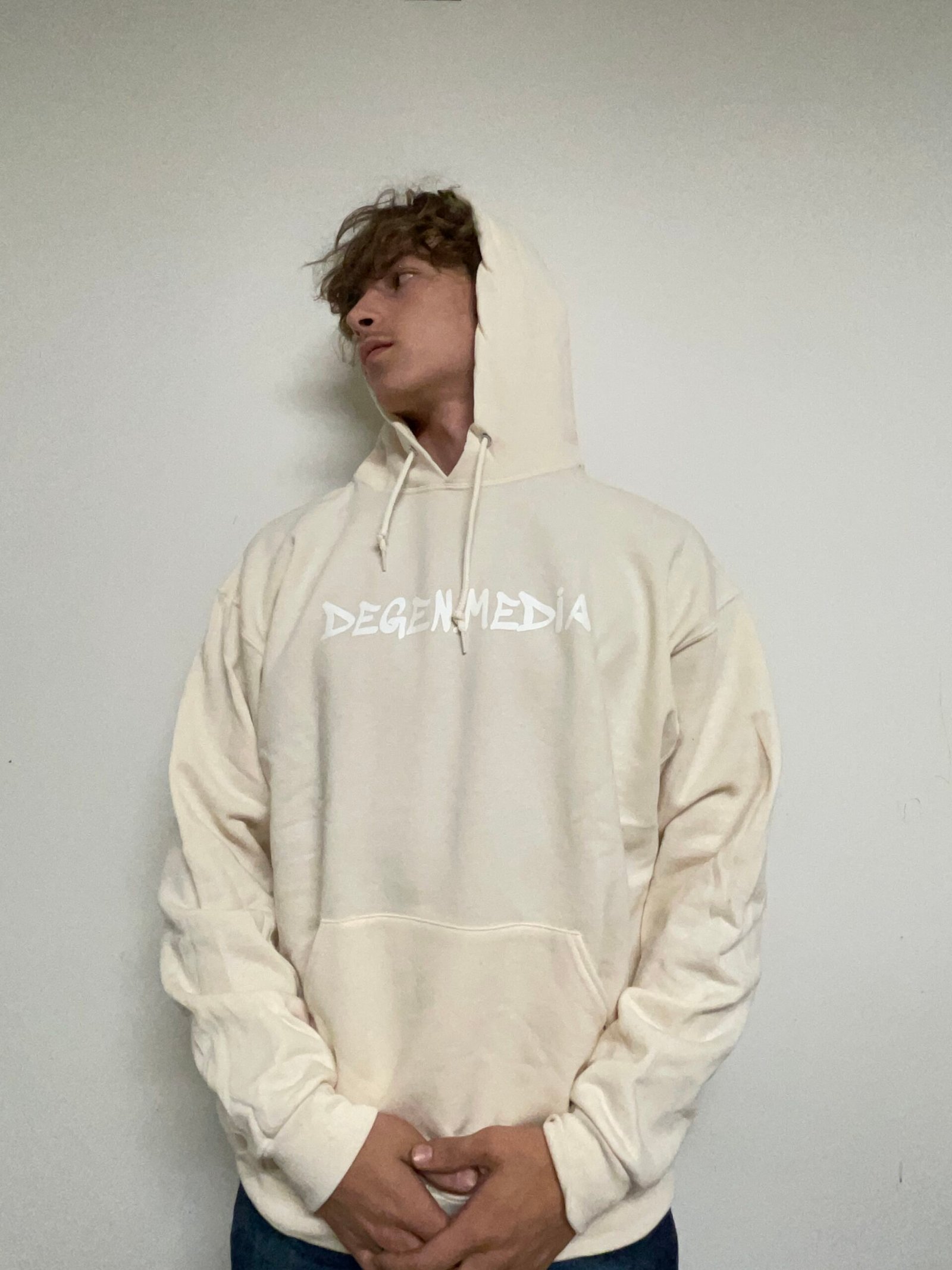 Step into the epitome of streetwear excellence with our premium hoodie. Designed for those who demand nothing but the best, this lighter hoodie features a cream base adorned with stunning white and golden off-white accents. A symphony of style and sophistication comes to life with ‘Degen.Media’ strikingly displayed across the chest, letting the world know you mean business.